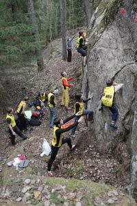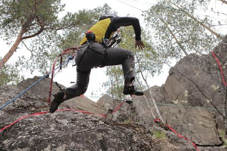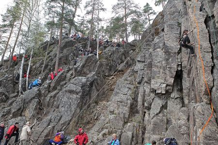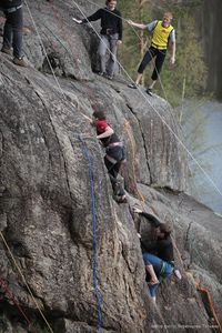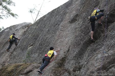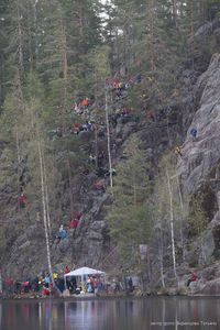 Ну а кто не знает - Скальный Фестиваль ежегодно собирает на берегах озера Ястребиное тысячи любителей активного отдыха - только участников Марафона "Скалолазание для всех" было в этом году более шестисот взрослых и более сотни детей. Марафон - гвоздь программы, 80 коротких скальных маршрутов различной сложности, которые в желтых "лидерских" майках можно было пытаться преодолевать в течение трех дней.